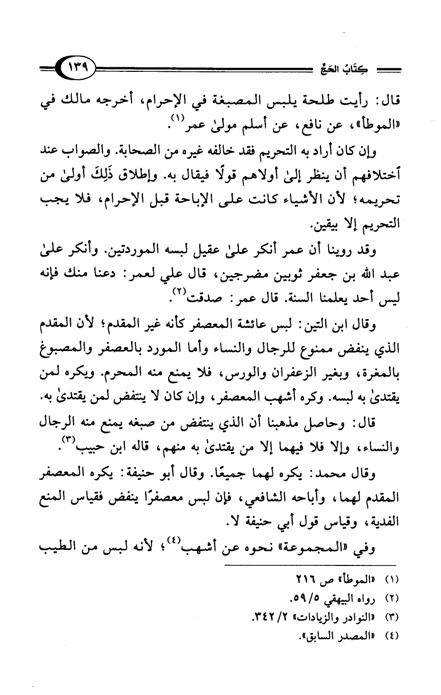 قال: رأيت طلحة يلبس المصبغة في الإحرام، أخرجه مالك في "الموطأ"، عن نافع، عن أسلم مولى عمر (¬1).