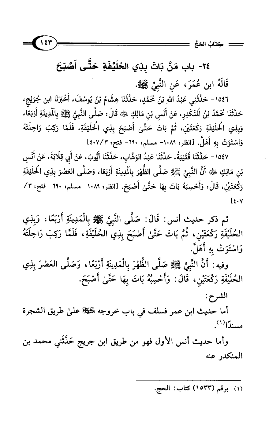 1546 - حَدَّثَنِي عَبْدُ اللهِ بْنُ مُحَمَّدٍ، حَدَّثَنَا هِشَامُ بْنُ يُوسُفَ، أَخْبَرَنَا ابْنُ جُرَيْجٍ، حَدَّثَنَا مُحَمَّدُ بْنُ المُنْكَدِرِ، عَنْ أَنَسِ بْنِ مَالِكٍ - رضي الله عنه - قَالَ: صَلَّى النَّبِيُّ - صلى الله عليه وسلم - بِالمَدِينَةِ أَرْبَعًا، وَبِذِي الحُلَيْفَةِ رَكْعَتَيْنِ، ثُمَّ بَاتَ حَتَّى أَصْبَحَ بِذِي الحُلَيْفَةِ، فَلَمَّا رَكِبَ رَاحِلَتَهُ وَاسْتَوَتْ بِهِ أَهَلَّ. [انظر: 1089 - مسلم: 690 - فتح: 3/ 407]