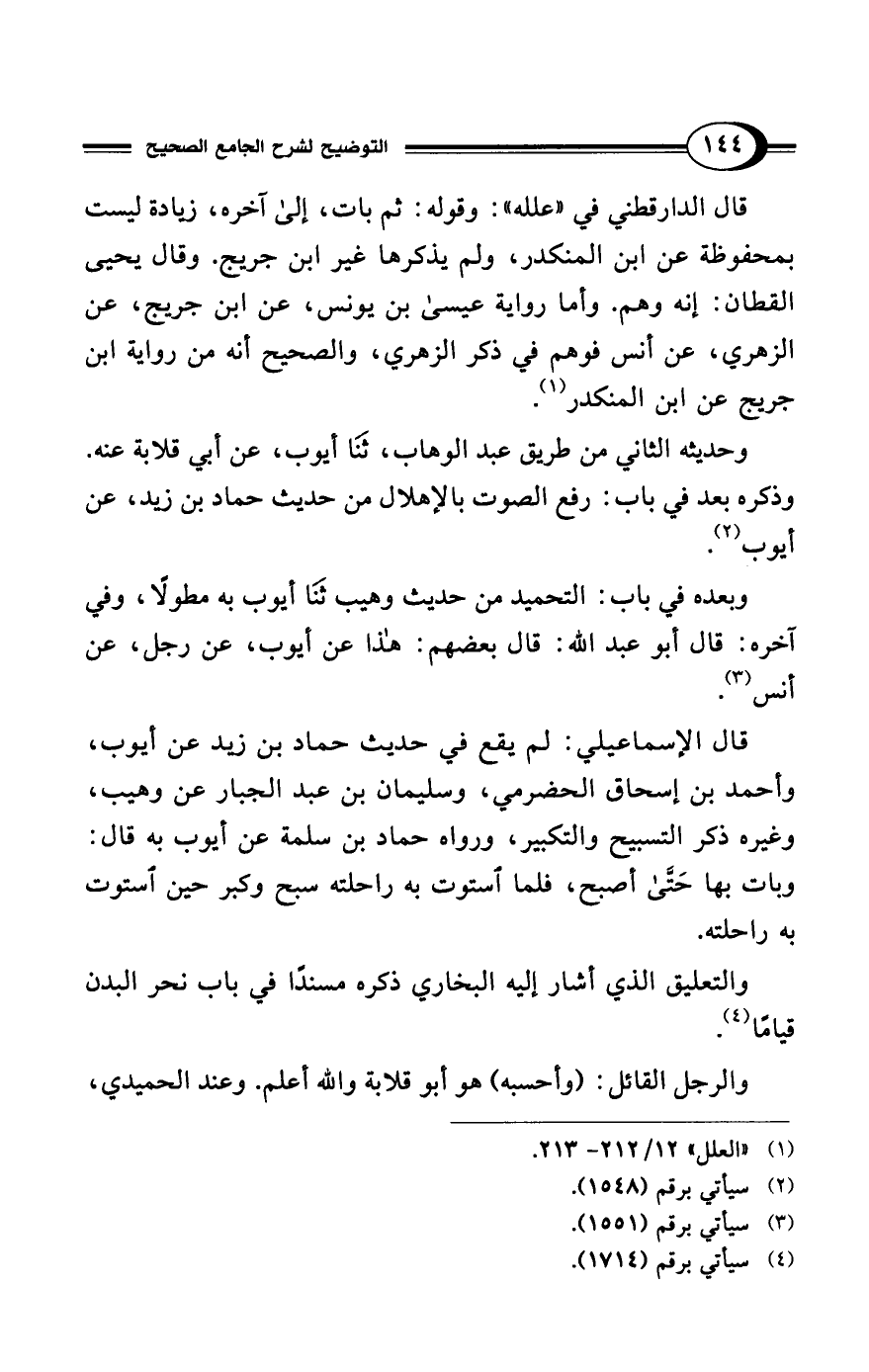 قال الدارقطني في "علله": وقوله: ثم بات، إلى آخره، زيادة ليست بمحفوظة عن ابن المنكدر، ولم يذكرها غير ابن جريج. وقال يحيى القطان: إنه وهم. وأما رواية عيسى بن يونس، عن ابن جريج، عن الزهري، عن أنس فوهم في ذكر الزهري، والصحيح أنه من رواية ابن جريج عن ابن المنكدر (¬1).