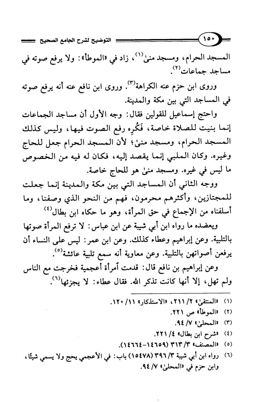 واحتج إسماعيل للقولين فقال: وجه الأول أن مساجد الجماعات إنما بنيت للصلاة خاصة، فَكُرِه رفع الصوت فيها، وليس كذلك المسجد الحرام، ومسجد منى؛ لأن المسجد الحرام جعل للحاج وغيره. وكان الملبي إنما يقصد إليه، فكان له فيه من الخصوص ما ليس في غيره. ومسجد منى هو للحاج خاصة.