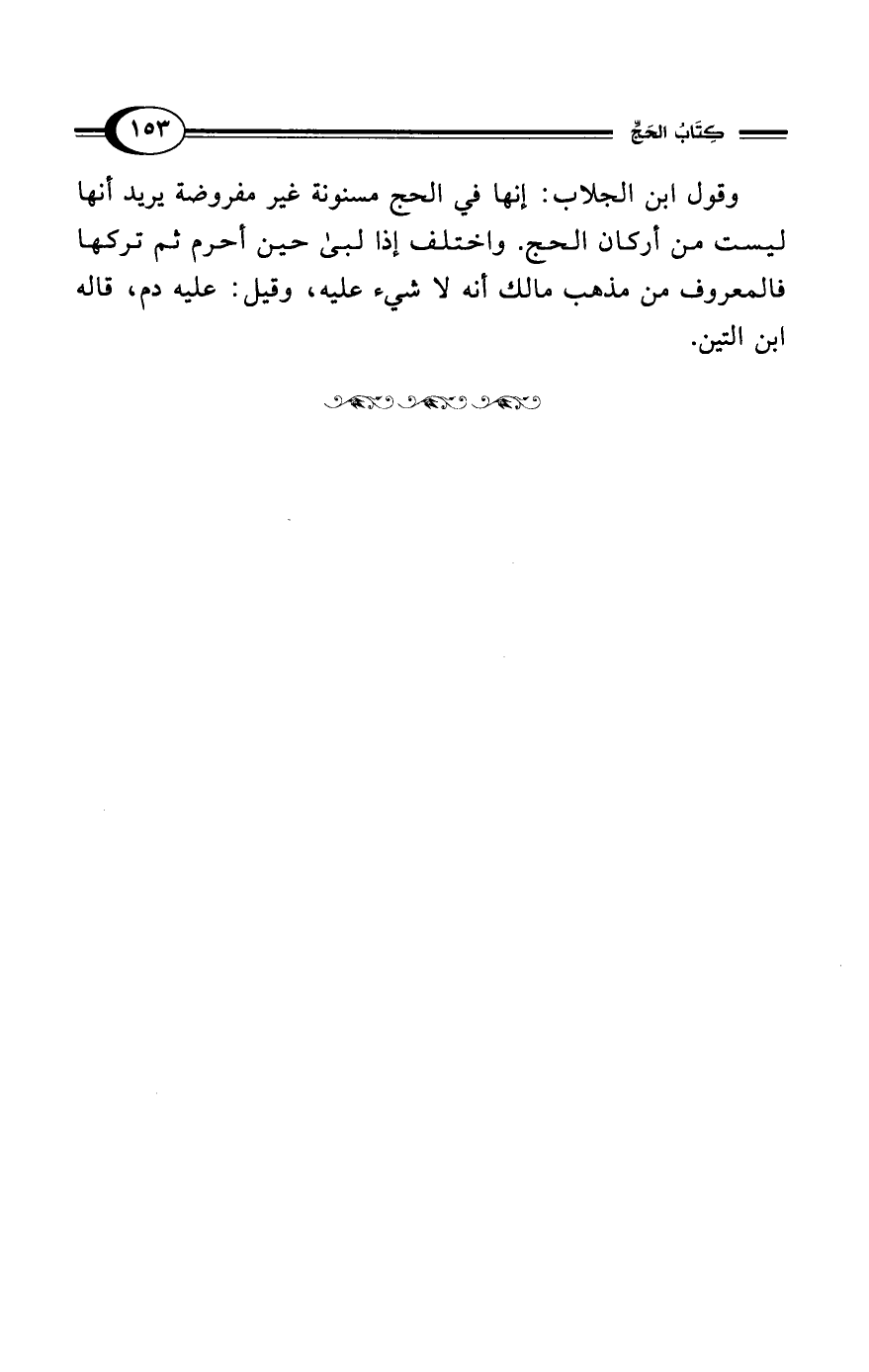 وقول ابن الجلاب: إنها في الحج مسنونة غير مفروضة يريد أنها ليست من أركان الحج. واختلف إذا لبى حين أحرم ثم تركها فالمعروف من مذهب مالك أنه لا شيء عليه، وقيل: عليه دم، قاله ابن التين.