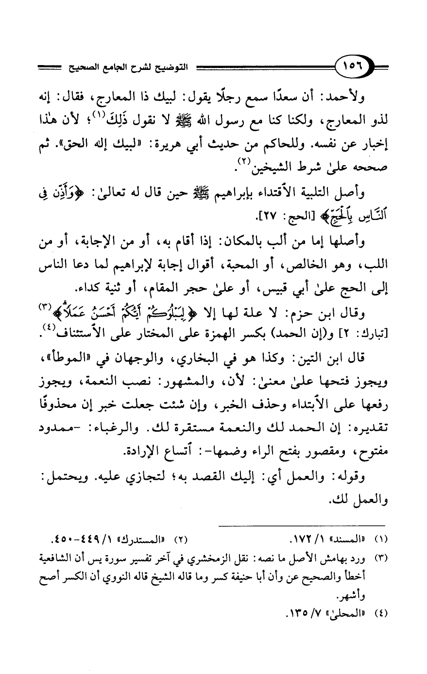 ولأحمد: أن سعدًا سمع رجلًا يقول: لبيك ذا المعارج، فقال: إنه لذو المعارج، ولكنا كنا مع رسول الله - صلى الله عليه وسلم - لا نقول ذَلِكَ (¬1)؛ لأن هذا إخبار عن نفسه. وللحاكم من حديث أبي هريرة: "لبيك إله الحق". ثم صححه على شرط الشيخين (¬2).
