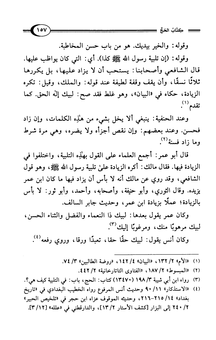 قال أبو عمر: أجمع العلماء على القول بهذِه التلبية، واختلفوا في الزيادة فيها. فقال مالك: أكره الزيادة على تلبية رسول الله - صلى الله عليه وسلم -، وهو قول الشافعي، وقد روي عن مالك أنه لا بأس أن يزاد فيها ما كان ابن عمر يزيده. وقال الثوري، وأبو حنيفة، وأصحابه، وأحمد، وأبو ثور: لا بأس بالزيادة؛ عملًا بزيادة ابن عمر، وحديث جابر السالف.