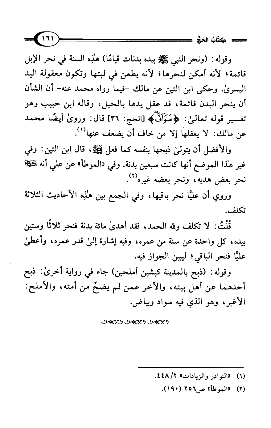 وقوله: (ونحر النبي - صلى الله عليه وسلم - بيده بدنات قيامًا) هذِه السنة في نحر الإبل قائمة؛ لأنه أمكن لنحرها؛ لأنه يطعن في لبتها وتكون معقولة اليد اليسرى. وحكى ابن التين عن مالك -فيما رواه محمد عنه- أن الشأن أن ينحر البدن قائمة، قد عقل يدها بالحبل، وقاله ابن حبيب وهو تفسير قوله تعالى: {صَوَافَّ} [الحج: 36]، قال: وروى أيضًا محمد عن مالك: لا يعقلها إلا من خاف أن يضعف عنها (¬1).
