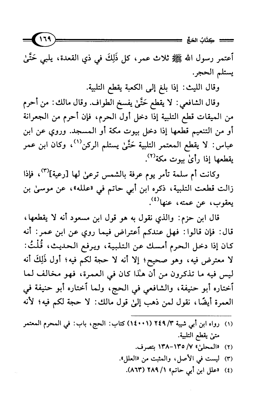 قال ابن حزم؛ والذي نقول به هو قول ابن مسعود أنه لا يقطعها، قال: فإن قالوا: فهل عندكم اعتراض فيما روي عن ابن عمر: أنه كان إذا دخل الحرم أمسك عن التلبية، ويرفع الحديث، قُلْتُ: