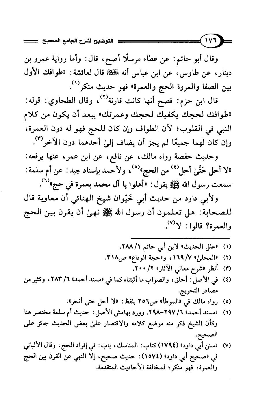(¬7) "سنن أبي داود" (1794) كتاب: المناسك، باب: في إفراد الحج، وقال الألباني في "صحيح أبي داود" (1574): حديث صحيح، إلا النهي عن القرن بين الحج والعمرة؛ فهو منكر؛ لمخالفة الأحاديث المتقدمة.