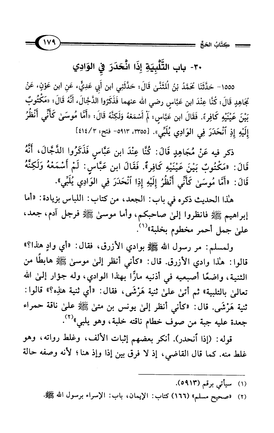 ذكر فيه عَنْ مُجَاهِدٍ قَالَ: كُنَّا عِنْدَ ابن عَبَّاسٍ فَذَكَرُوا الدَّجَّالَ، أَنَّهُ قَالَ: "مَكْتُوبٌ بَيْنَ عَيْنَيْهِ كافِرٌ". فَقَالَ ابن عَبَّاسٍ: لَمْ أَسْمَعْهُ وَلَكِنَّهُ قَالَ: "أَمَّا مُوسَى كَأَنِّي أَنْظُرُ إِلَيْهِ إِذِا انْحَدَرَ فِي الوَادِي يُلَبِّي".