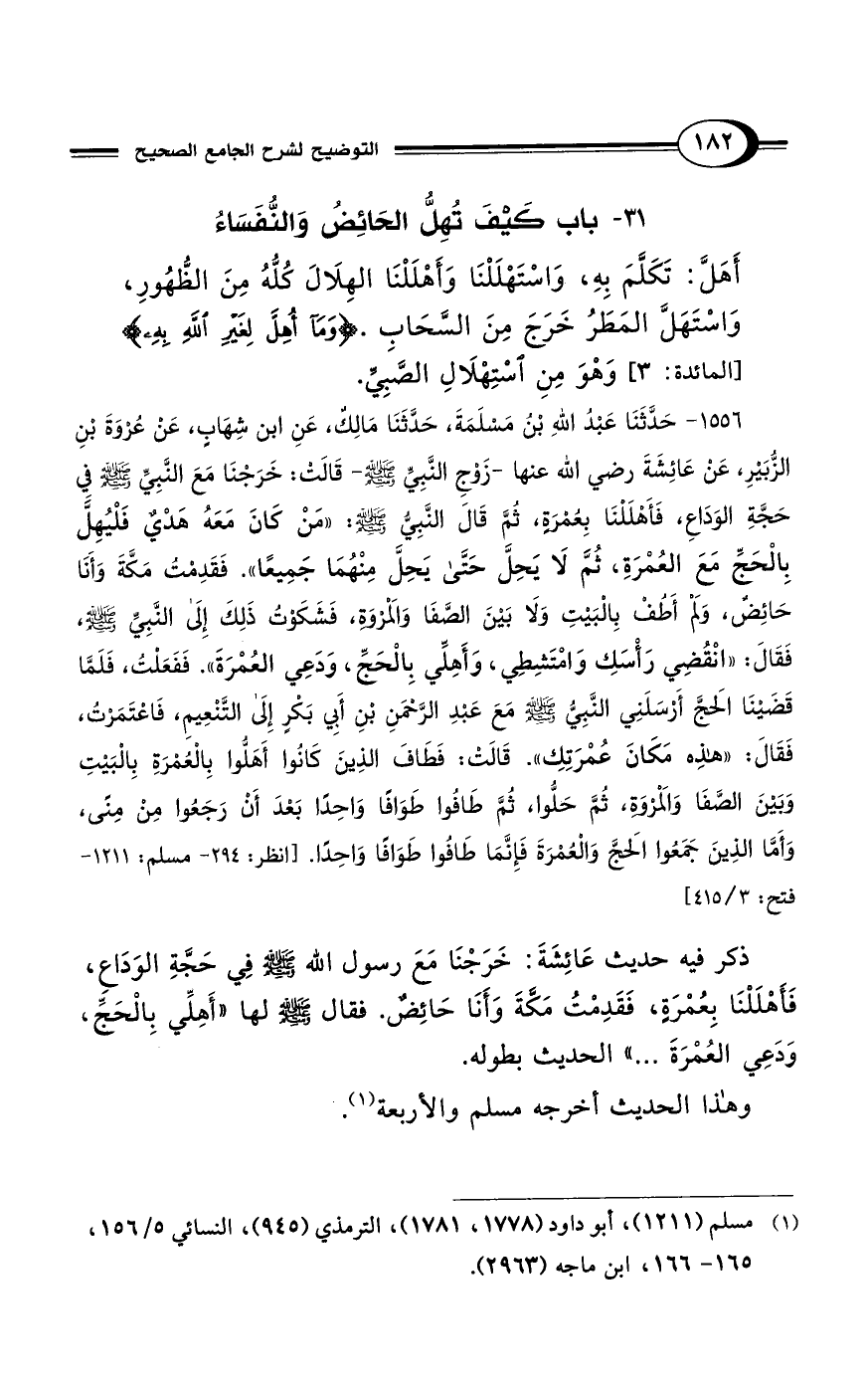 ذكر فيه حديث عَائِشَةَ: خَرَجْنَا مَعَ رسول الله - صلى الله عليه وسلم - فِي حَجَّةِ الوَدَاعِ، فَأهْلَلْنَا بِعُمْرَةٍ، فَقَدِمْتُ مَكَّةَ وَأَنَا حَائِضٌ. فقال - صلى الله عليه وسلم - لها "أَهِلِّي بِالحَجِّ، وَدَعِي العُمْرَةَ ... " الحديث بطوله.