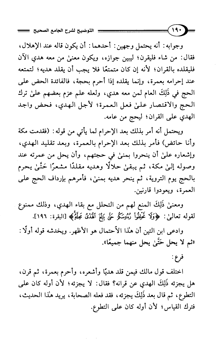 وجوابه: أنه يحتمل وجهين: أحدهما: أن يكون قاله عند الإهلال، فقال: من شاء فليقرن؛ ليبين جوازه، ويكون معنى من معه هدي الآن فليقلده بالقران؛ لأنه إن كان متمتعًا فلا يجب أن يقلد هديه؛ لتمتعه عند إحرامه بعمرة، وإنما يقلده إذا أحرم بحجة، فالفائدة الحض على الحج في ذَلِكَ العام لمن معه هدي، ولعله علم عزم بعضهم على ترك الحج والاقتصار على فعل العمرة؛ لأجل الهدي، فحض واجد