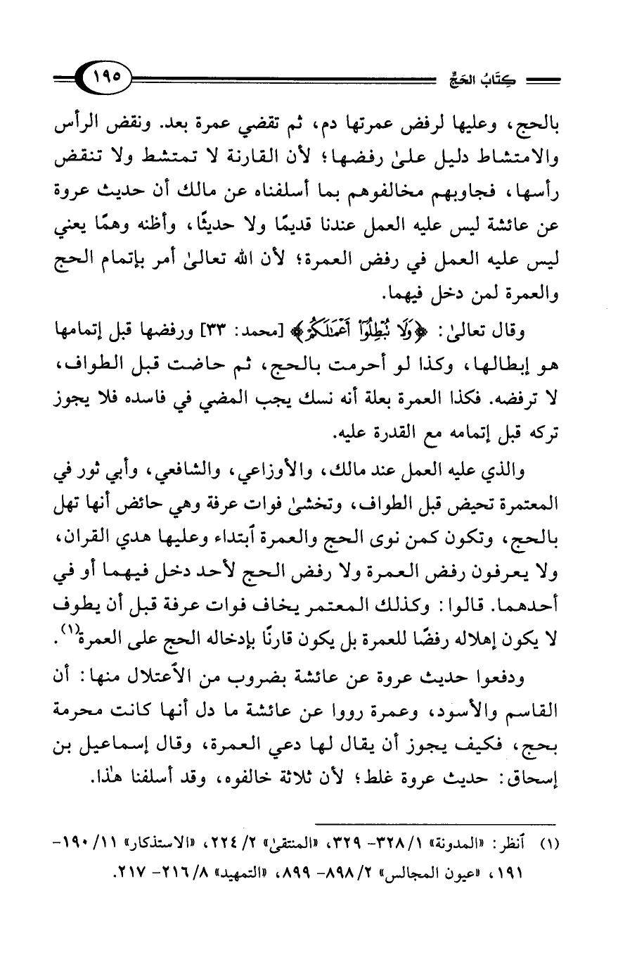 بالحج، وعليها لرفض عمرتها دم، ثم تقضي عمرة بعد. ونقض الرأس والامتشاط دليل على رفضها؛ لأن القارنة لا تمتشط ولا تنقض رأسها، فجاوبهم مخالفوهم بما أسلفناه عن مالك أن حديث عروة عن عائشة ليس عليه العمل عندنا قديمًا ولا حديثًا، وأظنه وهمًا يعني ليس عليه العمل في رفض العمرة؛ لأن الله تعالى أمر بإتمام الحج والعمرة لمن دخل فيهما.