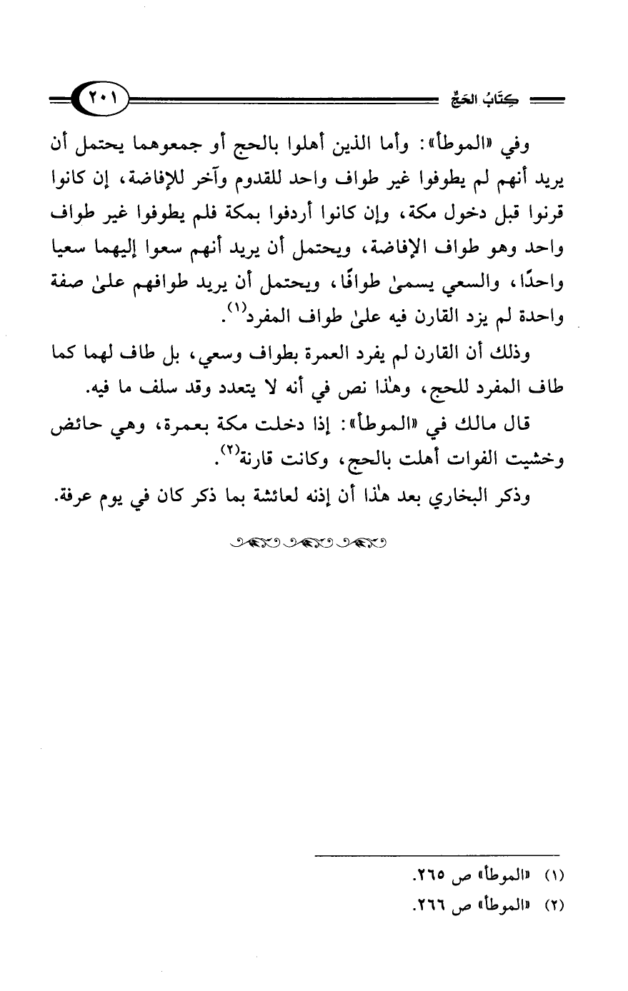 وفي "الموطأ": وأما الذين أهلوا بالحج أو جمعوهما يحتمل أن يريد أنهم لم يطوفوا غير طواف واحد للقدوم وآخر للإفاضة، إن كانوا قرنوا قبل دخول مكة، وإن كانوا أردفوا بمكة فلم يطوفوا غير طواف واحد وهو طواف الإفاضة، ويحتمل أن يريد أنهم سعوا إليهما سعيا واحدًا، والسعي يسمى طوافًا، ويحتمل أن يريد طوافهم على صفة واحدة لم يزد القارن فيه على طواف المفرد (¬1).