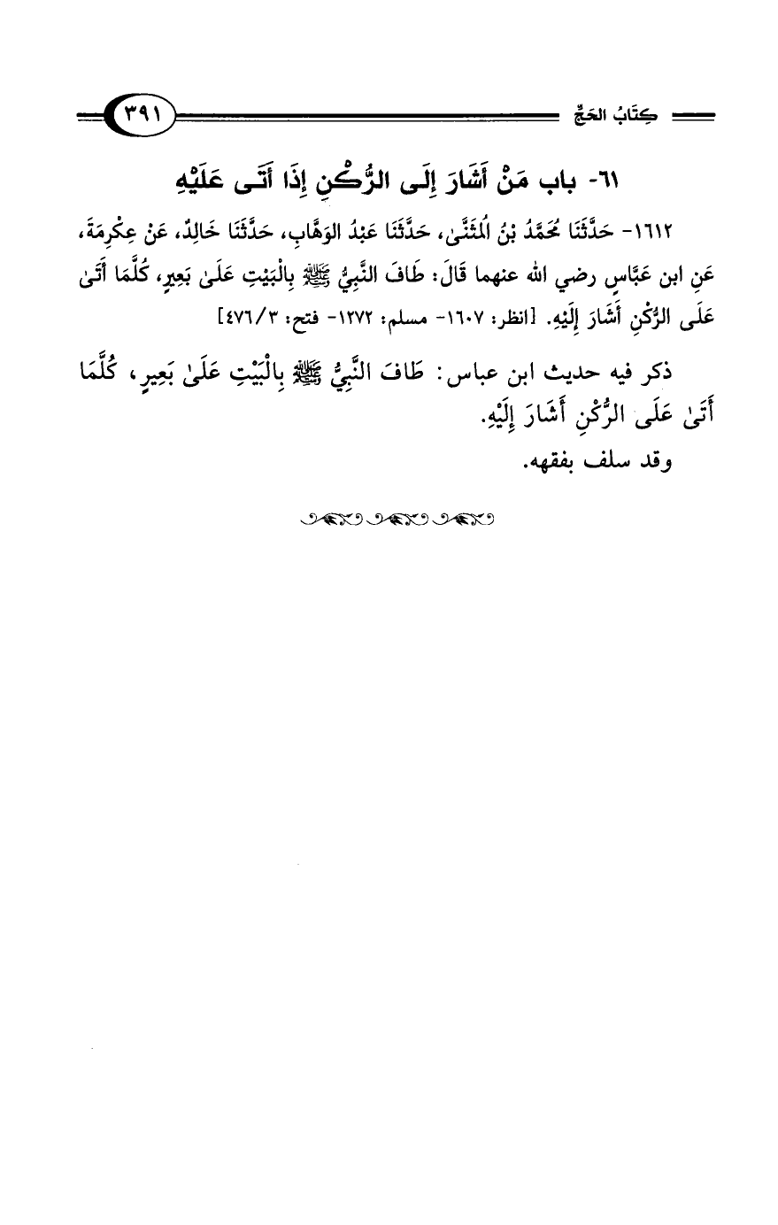 1612 - حَدَّثَنَا مُحَمَّدُ بْنُ المُثَنَّى، حَدَّثَنَا عَبْدُ الوَهَّابِ، حَدَّثَنَا خَالِدٌ، عَنْ عِكْرِمَةَ، عَنِ ابْنِ عَبَّاسٍ رضي الله عنهما قَالَ: طَافَ النَّبِيُّ - صلى الله عليه وسلم - بِالبَيْتِ عَلَى بَعِيرٍ، كُلَّمَا أَتَى عَلَى الرُّكْنِ أَشَارَ إِلَيْهِ. [انظر: 1607 - مسلم: 1272 - فتح: 3/ 476]