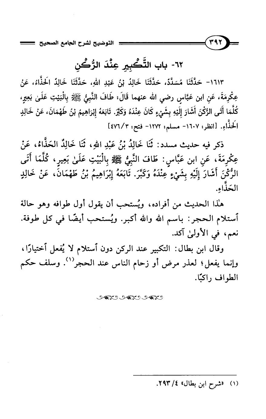 1613 - حَدَّثَنَا مُسَدَّدٌ، حَدَّثَنَا خَالِدُ بْنُ عَبْدِ اللهِ، حَدَّثَنَا خَالِدٌ الحَذَّاءُ، عَنْ عِكْرِمَةَ، عَنِ ابْنِ عَبَّاسٍ رضي الله عنهما قَالَ: طَافَ النَّبِيُّ - صلى الله عليه وسلم - بِالبَيْتِ عَلَى بَعِيرٍ، كُلَّمَا أَتَى الرُّكْنَ أَشَارَ إِلَيْهِ بِشَيْءٍ كَانَ عِنْدَهُ وَكَبَّرَ. تَابَعَهُ إِبْرَاهِيمُ بْنُ طَهْمَانَ، عَنْ خَالِدٍ الحَذَّاءِ. [انظر: 1607 - مسلم: 1272 - فتح: 3/ 476]