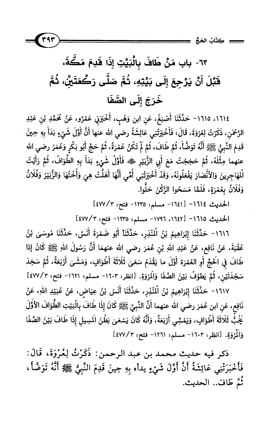 1614 و 1615 - حَدَّثَنَا أَصْبَغُ، عَنِ ابْنِ وَهْبٍ، أَخْبَرَنِي عَمْرٌو، عَنْ مُحَمَّدِ بْنِ عَبْدِ الرَّحْمَنِ، ذَكَرْتُ لِعُرْوَةَ، قَالَ: فَأَخْبَرَتْنِي عَائِشَةُ رضي الله عنها أَنَّ أَوَّلَ شَيْءٍ بَدَأَ بِهِ حِينَ قَدِمَ النَّبِيُّ - صلى الله عليه وسلم - أَنَّهُ تَوَضَّأَ، ثُمَّ طَافَ، ثُمَّ لَمْ تَكُنْ عُمْرَةً، ثُمَّ حَجَّ أَبُو بَكْرٍ وَعُمَرُ رضي الله عنهما مِثْلَهُ، ثُمَّ حَجَجْتُ مَعَ أَبِي الزُّبَيْرِ - رضي الله عنه - فَأَوَّلُ شَيْءٍ بَدَأَ بِهِ الطَّوَافُ، ثُمَّ رَأَيْتُ المُهَاجِرِينَ وَالأَنْصَارَ يَفْعَلُونَهُ، وَقَدْ أَخْبَرَتْنِي أُمِّي أَنَّهَا أَهَلَّتْ هِيَ وَأُخْتُهَا وَالزُّبَيْرُ وَفُلاَنٌ وَفُلاَنٌ بِعُمْرَةٍ، فَلَمَّا مَسَحُوا الرُّكْنَ حَلُّوا.