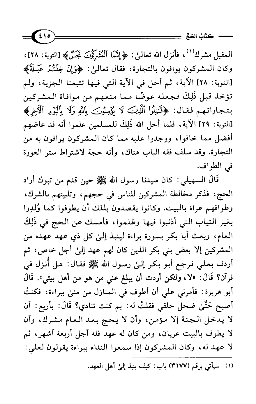 قَالَ السهيلي: كان سيدنا رسول الله - صلى الله عليه وسلم - حين قدم من تبوك أراد الحج، فذكر مخالطة المشركين للناس في حجهم، وتلبيتهم بالشرك، وطوافهم عراة بالبيت. وكانوا يقصدون بذلك أن يطوفوا كما وُلدِوا بغير الثياب التي أذنبوا فيها وظلموا، فأمسك عن الحج في ذَلِكَ العام، وبعث أبا بكر بسورة براءة لينبذ إلى كل ذي عهد عهده من المشركين إلا بعض بني بكر الذين كان لهم عهد إلى أجل خاص، ثم أردف بعلي فرجع أبو بكر إلى رسول الله - صلى الله عليه وسلم - فقال: هل أُنزل في قرآن؟ قَالَ: "لا، ولكن أردت أن يبلغ عني من هو من أهل بيتي". قَالَ أبو هريرة: فأمرني علي أن أطوف في المنازل من منى ببراءة، فكنتُ أصيح حَتَّى ضحل حلقي فقلتُ له: بم كنت تنادي؟ قَالَ: بأربع: أن لا يدخل الجنة إلا مؤمن، وأن لا يحج بعد العام مشرك، وأن لا يطوف بالبيت عريان، ومن كان له عهد فله أجل أربعة أشهر، ثم لا عهد له، وكان المشركون إذا سمعوا النداء ببراءة يقولون لعلي: