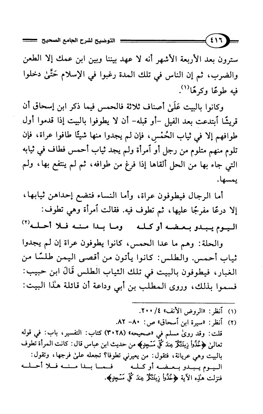 قلت: وقد روى مسلم في "صحيحه" (3028) كتاب: التفسير، باب: في قوله تعالى {خُذُوا زِينَتَكُمْ عِنْدَ كُلِّ مَسْجِدٍ} من حديث ابن عباس قال: كانت المرأة تطوف بالبيت وهي عريانة، فتقول: من يعيرني تطوفا؟ تجعله على فرجها، وتقول:
