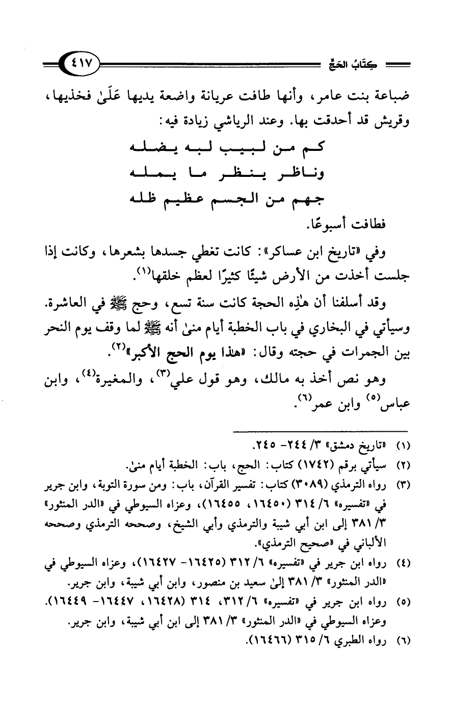 ضباعة بنت عامر، وأنها طافت عريانة واضعة يديها عَلَى فخذيها، وقريش قد أحدقت بها. وعند الرياشي زيادة فيه: