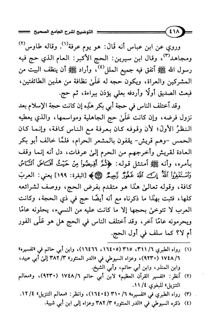 وقد اختلف الناس في حجة أبي بكر هذِه إن كانت حجة الإسلام بعد نزول فرضه، وإن كانت عَلَى حج الجاهلية ومواسمها، والذي يعطيه النظرُ الأولَ؛ لأن وقوفه كان بعرفة مع الناس كافة، وإنما كان الحمس -وهم قريش- يقفون بالمشعر الحرام، فلمَّا خالف أبو بكر العادة لقريش وأخرجهم من الحرم إلى عرفات، دل أنه إنما وقف بأمره، وأنه - صلى الله عليه وسلم - امتثل قوله: {ثُمَّ أَفِيضُوا مِنْ حَيْثُ أَفَاضَ النَّاسُ وَاسْتَغْفِرُوا اللَّهَ إِنَّ اللَّهَ غَفُورٌ رَحِيمٌ (199)} [البقرة: 199] يعني: العربَ كافة، وقوله تعالى هذا هو متقدم بفرض الحج، ووصف لشرائعه كلها، فثبت بهذا ما ذكرناه مع أنه أيضًا حج في ذي الحجة، وكانت العرب لا تتوخى بحجها إلا ما كانت عليه من النسيء، يحلونه عامًا ويحرمونه عامًا آخر، وقد اختلف الناس في الحج هل هو عَلَى الفور أم لا؟ كما سلف في أول الحج.