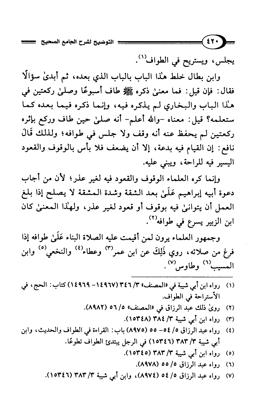 (¬4) رواه عبد الرزاق 5/ 54 - 55 (8975) باب: القراءة في الطواف والحديث، وابن أبي شيبة 3/ 383 (15346) في الرجل يبتدئ الطواف تطوعًا.