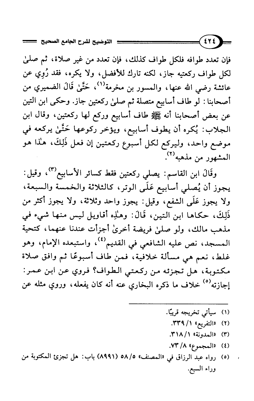 فإن تعدد طوافه فلكل طواف كذلك، فإن تعدد من غير صلاة، ثم صلى لكل طواف ركعتيه جاز، لكنه تارك للأفضل، ولا يكره، فقد رُوِي عن عائشة رضي الله عنها، والمسور بن مخرمة (¬1)، حَتَّى قَالَ الضميري من أصحابنا: لوطاف أسابيع متصلة ثم صلى ركعتين جاز. وحكى ابن التين عن بعض أصحابنا أنه - صلى الله عليه وسلم - طاف أسابيع وركع لها ركعتين، وقال ابن الجلاب: يُكره أن يطوف أسابيع، ويؤخر ركوعها حَتَّى يركعه في موضع واحد، وليركع لكل أسبوع ركعتين إن فعل ذَلِكَ، هذا هو المشهور من مذهبه (¬2).