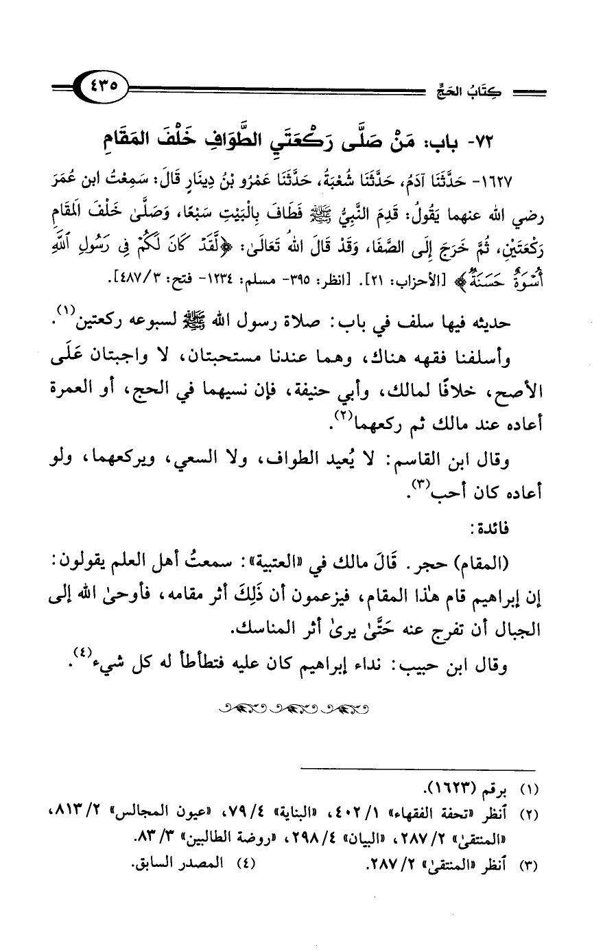 1627 - حَدَّثَنَا آدَمُ، حَدَّثَنَا شُعْبَةُ، حَدَّثَنَا عَمْرُو بْنُ دِينَارٍ قَالَ: سَمِعْتُ ابْنَ عُمَرَ رضي الله عنهما يَقُولُ: قَدِمَ النَّبِيُّ - صلى الله عليه وسلم - فَطَافَ بِالبَيْتِ سَبْعًا، وَصَلَّى خَلْفَ المَقَامِ رَكْعَتَيْنِ، ثُمَّ خَرَجَ إِلَى الصَّفَا، وَقَدْ قَالَ اللهُ تَعَالَى: {لَقَدْ كَانَ لَكُمْ فِي رَسُولِ اللهِ أُسْوَةٌ حَسَنَةٌ} [الأحزاب: 21]. [انظر: 395 - مسلم: 1234 - فتح: 3/ 487].