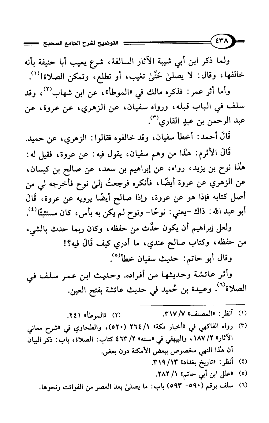 ولما ذكر ابن أبي شيبة الآثار السالفة، شرع يعيب أبا حنيفة بأنه خالفها، وقال: لا يصلى حَتَّى تغيب، أو تطلع، وتمكن الصلاة! (¬1).