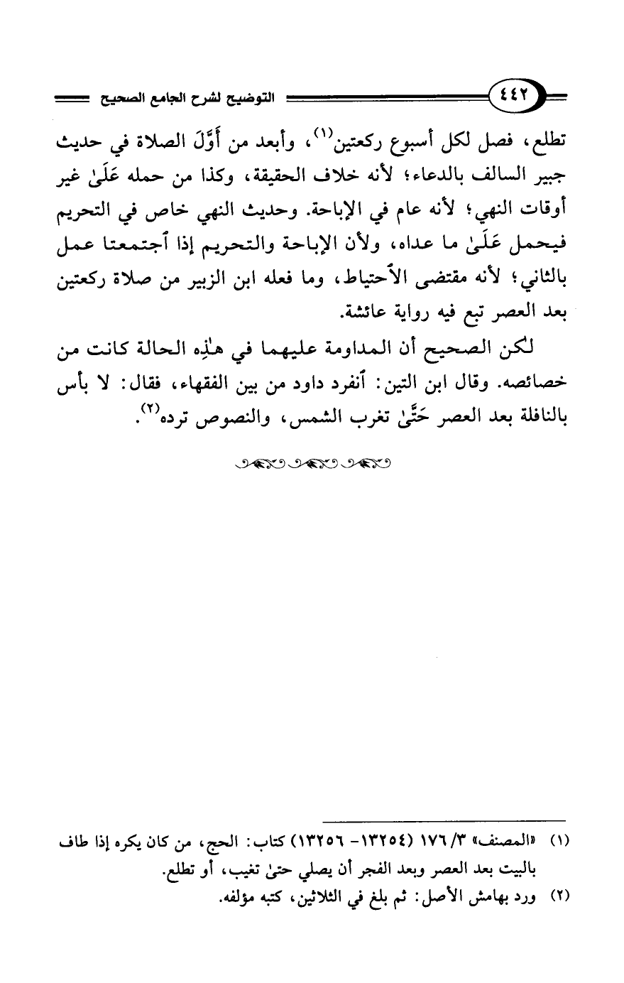 تطلع، فصل لكل أسبوع ركعتين (¬1)، وأبعد من أَوَّلَ الصلاة في حديث جبير السالف بالدعاء؛ لأنه خلاف الحقيقة، وكذا من حمله عَلَى غير أوقات النهي؛ لأنه عام في الإباحة. وحديث النهي خاص في التحريم فيحمل عَلَى ما عداه، ولأن الإباحة والتحريم إذا اجتمعتا عمل بالثاني؛ لأنه مقتضى الاحتياط، وما فعله ابن الزبير من صلاة ركعتين بعد العصر تبع فيه رواية عائشة.