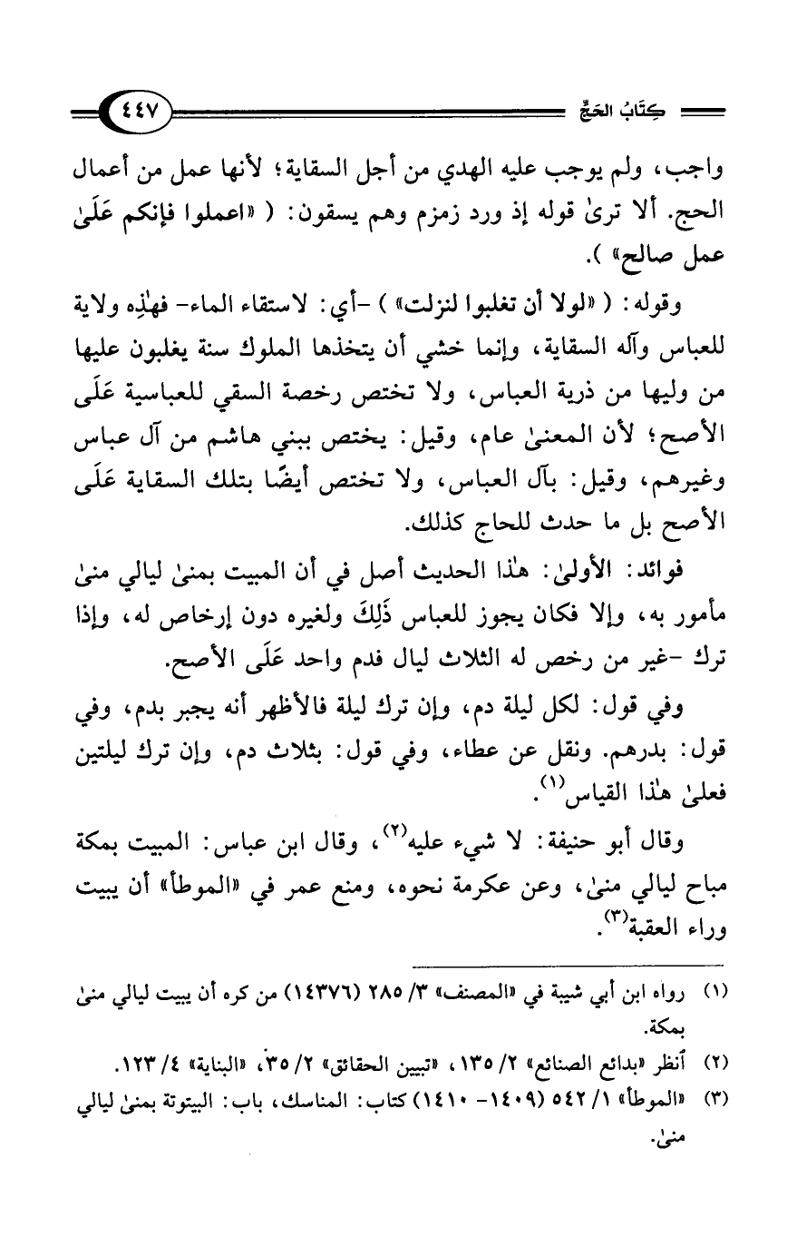 واجب، ولم يوجب عليه الهدي من أجل السقاية؛ لأنها عمل من أعمال الحج. ألا ترى قوله إذ ورد زمزم وهم يسقون: ("اعملوا فإنكم عَلَى عمل صالح").