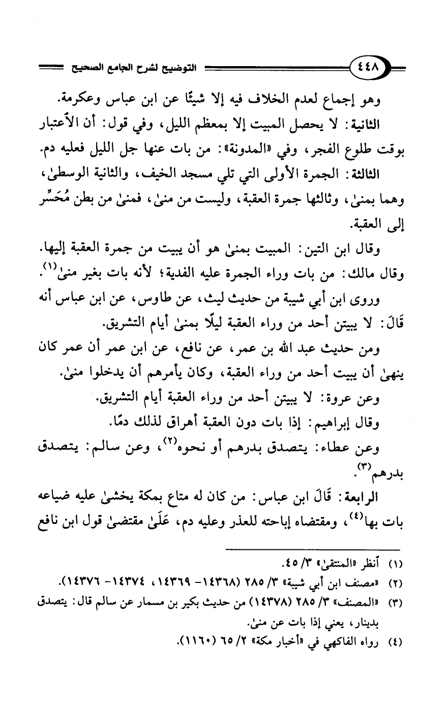 وروى ابن أبي شيبة من حديث ليث، عن طاوس، عن ابن عباس أنه قَالَ: لا يبيتن أحد من وراء العقبة ليلًا بمنى أيام التشريق.