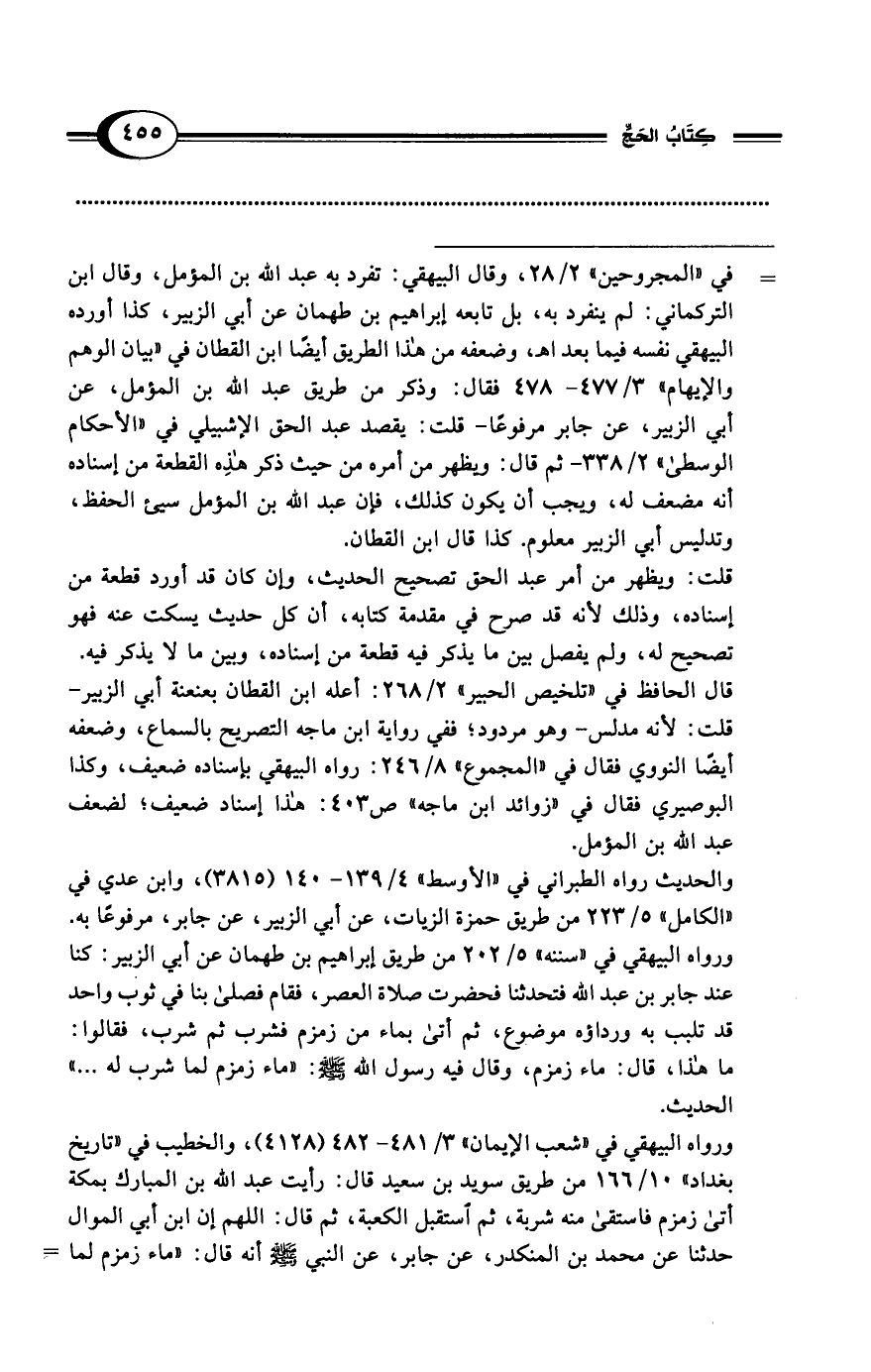 = في "المجروحين" 2/ 28، وقال البيهقي: تفرد به عبد الله بن المؤمل، وقال ابن التركماني: لم ينفرد به، بل تابعه إبراهيم بن طهمان عن أبي الزبير، كذا أورده البيهقي نفسه فيما بعد اهـ، وضعفه من هذا الطريق أيضًا ابن القطان في "بيان الوهم والإيهام" 3/ 477 - 478 فقال: وذكر من طريق عبد الله بن المؤمل، عن أبي الزبير، عن جابر مرفوعًا -قلت: يقصد عبد الحق الإشبيلي في "الأحكام الوسطى" 2/ 338 - ثم قال: ويظهر من أمره من حيث ذكر هذِه القطعة من إسناده أنه مضعف له، ويجب أن يكون كذلك، فإن عبد الله بن المؤمل سيئ الحفظ، وتدليس أبي الزبير معلوم. كذا قال ابن القطان.
