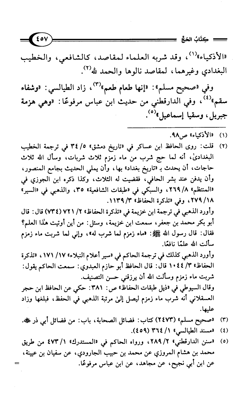 وأورد الذهبي في ترجمة ابن خزيمة في "تذكرة الحفاظ" 2/ 721 (734) قال: قال أبو بكر محمد بن جعفر، سمعت ابن خزيمة، وسئل: من أين أوتيت هذا العلم؟ فقال: قال رسول الله - صلى الله عليه وسلم -: "ماء زمزم لما شرب له"، وإني لما شربت ماء زمزم سألت الله علمًا نافعًا.