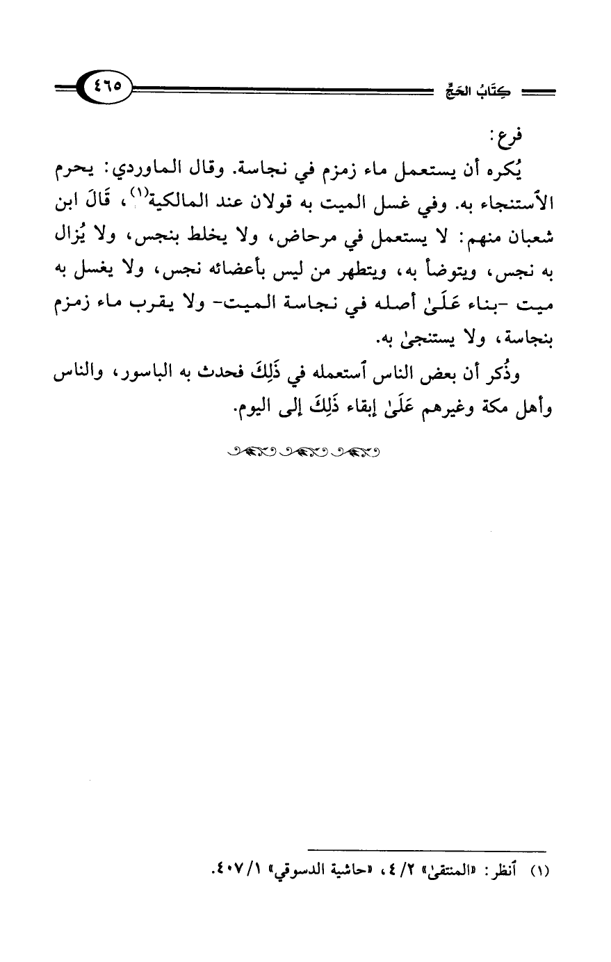 يُكره أن يستعمل ماء زمزم في نجاسة. وقال الماوردي: يحرم الاستنجاء به. وفي غسل الميت به قولان عند المالكية (¬1)، قَالَ ابن شعبان منهم: لا يستعمل في مرحاض، ولا يخلط بنجس، ولا يُزال به نجس، ويتوضأ به، ويتطهر من ليس باعضائه نجس، ولا يغسل به ميت -بناء عَلَى أصله في نجاسة الميت- ولا يقرب ماء زمزم بنجاسة، ولا يستنجى به.