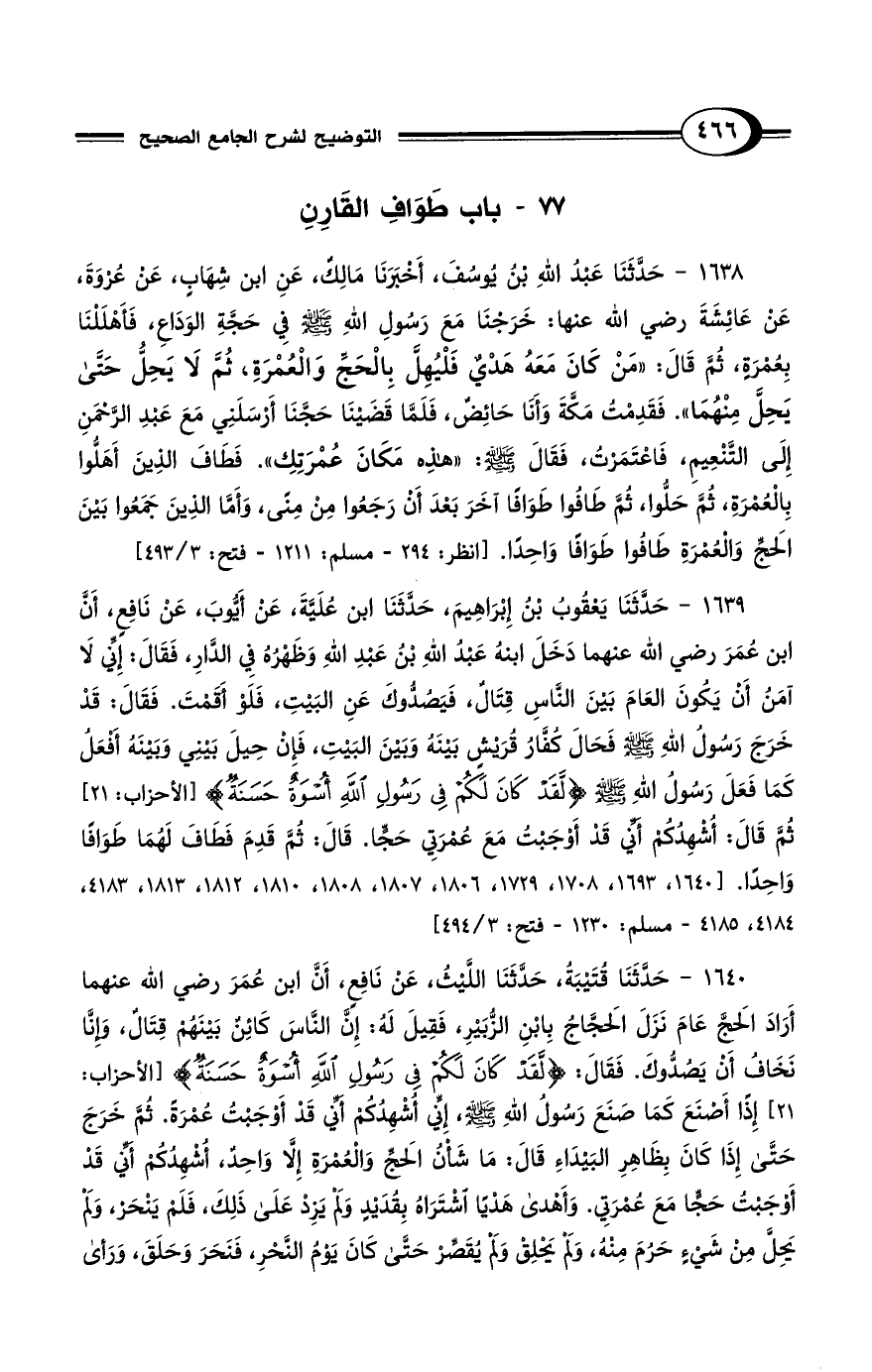 1639 - حَدَّثَنَا يَعْقُوبُ بْنُ إِبْرَاهِيمَ، حَدَّثَنَا ابْنُ عُلَيَّةَ، عَنْ أَيُّوبَ، عَنْ نَافِعٍ، أَنَّ ابْنَ عُمَرَ رضي الله عنهما دَخَلَ ابْنُهُ عَبْدُ اللهِ بْنُ عَبْدِ اللهِ وَظَهْرُهُ فِي الدَّارِ، فَقَالَ: إِنِّي لَا آمَنُ أَنْ يَكُونَ العَامَ بَيْنَ النَّاسِ قِتَالٌ، فَيَصُدُّوكَ عَنِ البَيْتِ، فَلَوْ أَقَمْتَ. فَقَالَ: قَدْ خَرَجَ رَسُولُ اللهِ - صلى الله عليه وسلم - فَحَالَ كُفَّارُ قُرَيْشٍ بَيْنَهُ وَبَيْنَ البَيْتِ، فَإِنْ حِيلَ بَيْنِي وَبَيْنَهُ أَفْعَلُ كَمَا فَعَلَ رَسُولُ اللهِ - صلى الله عليه وسلم - {لَقَدْ كَانَ لَكُمْ فِي رَسُولِ اللهِ أُسْوَةٌ حَسَنَةٌ} [الأحزاب: 21] ثُمَّ قَالَ: أُشْهِدُكُمْ أَنِّي قَدْ أَوْجَبْتُ مَعَ عُمْرَتِي حَجًّا. قَالَ: ثُمَّ قَدِمَ فَطَافَ لَهُمَا طَوَافًا وَاحِدًا. [1640، 1693، 1708، 1729، 1806، 1807، 1808، 1810، 1812، 1813، 4183، 4184، 4185 - مسلم: 1230 - فتح: 3/ 494]