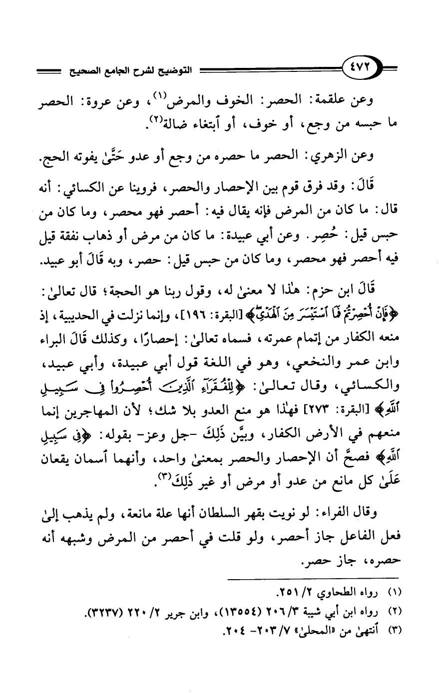 قَالَ ابن حزم: هذا لا معنى له، وقول ربنا هو الحجة؛ قال تعالى: {فَإِنْ أُحْصِرْتُمْ فَمَا اسْتَيْسَرَ مِنَ الْهَدْيِ} [البقرة: 196]، وإنما نزلت في الحديبية، إذ منعه الكفار من إتمام عمرته، فسماه تعالى: إحصارًا، وكذلك قَالَ البراء وابن عمر والنخعي، وهو في اللغة قول أبي عبيدة، وأبي عبيد، والكسائي، وقال تعالى: {لِلْفُقَرَاءِ الَّذِينَ أُحْصِرُوا فِي سَبِيلِ اللَّهِ} [البقرة: 273] فهذا هو منع العدو بلا شك؛ لأن المهاجرين إنما منعهم في الأرض الكفار، وبيَّن ذَلِكَ -جل وعز- بقوله: {فِي سَبِيلِ اللَّهِ} فصحَّ أن الإحصار والحصر بمعنى واحد، وأنهما اسمان يقعان عَلَى كل مانع من عدو أو مرض أو غير ذَلِكَ (¬3).