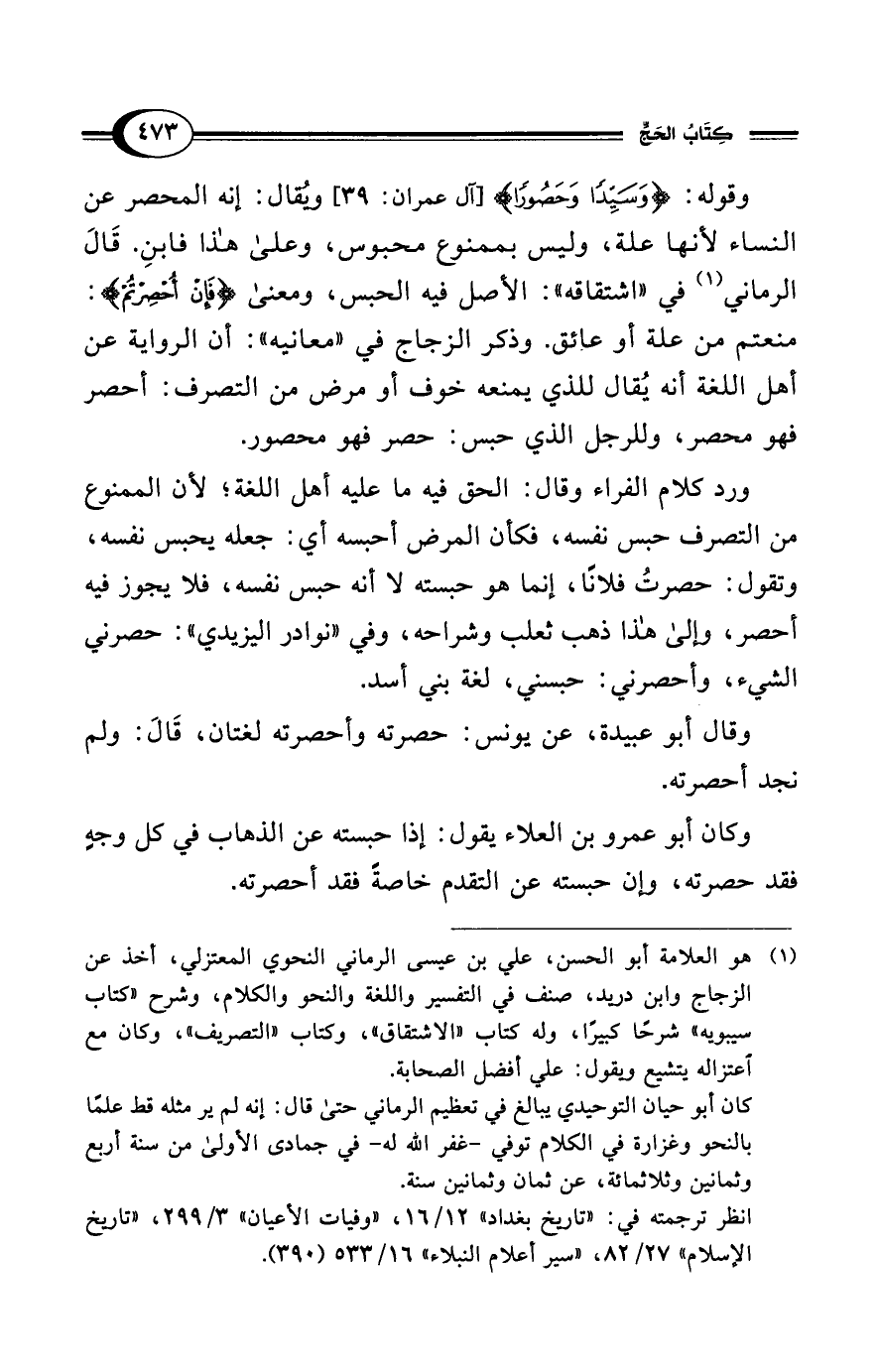 وقوله: {وَسَيِّدًا وَحَصُورًا} [آل عمران: 39] ويُقال: إنه المحصر عن النساء لأنها علة، وليس بممنوع محبوس، وعلى هذا فابنِ. قَالَ الرماني (¬1) في "اشتقاقه": الأصل فيه الحبس، ومعنى {فَإِنْ أُحْصِرْتُمْ}: منعتم من علة أو عائق. وذكر الزجاج في "معانيه": أن الرواية عن أهل اللغة أنه يُقال للذي يمنعه خوف أو مرض من التصرف: أحصر فهو محصر، وللرجل الذي حبس: حصر فهو محصور.