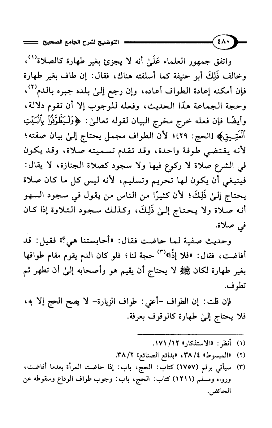 واتفق جمهور العلماء عَلَى أنه لا يجزئ بغير طهارة كالصلاة (¬1)، وخالف ذَلِكَ أبو حنيفة كما أسلفته هناك، فقال: إن طاف بغير طهارة فإن أمكنه إعادة الطواف أعاده، وإن رجع إلى بلده جبره بالدم (¬2)، وحجة الجماعة هذا الحديث، وفعله للوجوب إلا أن تقوم دلالة، وأيضًا فإن فعله خرج مخرج البيان لقوله تعالى: {وَلْيَطَّوَّفُوا بِالبَيْتِ العَتِيقِ} [الحج: 29]؛ لأن الطواف مجمل يحتاج إلى بيان صفته؛ لأنه يقتضي طوفة واحدة، وقد تقدم تسميته صلاة، وقد يكون في الشرع صلاة لا ركوع فيها ولا سجود كصلاة الجنازة، لا يقال: فينبغي أن يكون لها تحريم وتسليم، لأنه ليس كل ما كان صلاة يحتاج إلى ذَلِكَ؛ لأن كثيرًا من الناس من يقول في سجود السهو أنه صلاة ولا يحتاج إلى ذَلِكَ، وكذلك سجود التلاوة إذا كان في صلاة.