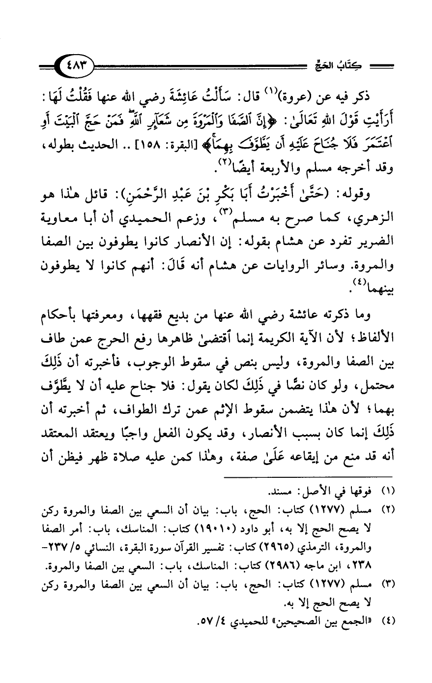 ذكر فيه عن (عروة) (¬1) قال: سَألْتُ عَائِشَةَ رضي الله عنها فَقُلْتُ لَهَا: أَرَأَيْتِ قَوْلَ اللهِ تَعَالَى: {إِنَّ الصَّفَا وَالمَرْوَةَ مِنْ شَعَائِرِ اللهِ فَمَنْ حَجَّ البَيْتَ أَوِ اعْتَمَرَ فَلَا جُنَاحَ عَلَيْهِ أَنْ يَطَّوَّفَ بِهِمَا} [البقرة: 158] .. الحديث بطوله، وقد أخرجه مسلم والأربعة أيضًا (¬2).