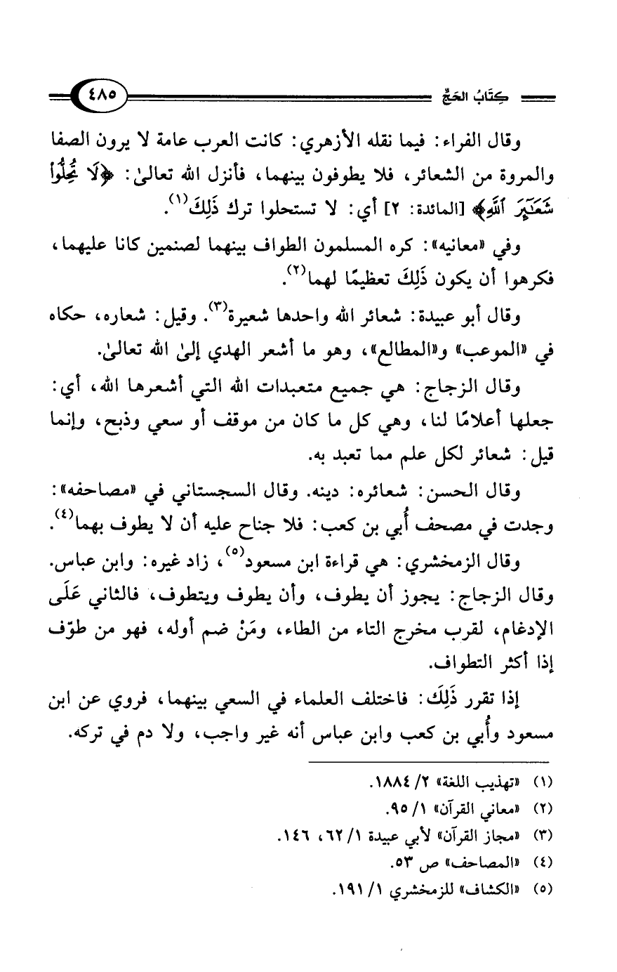 وقال الفراء: فيما نقله الأزهري: كانت العرب عامة لا يرون الصفا والمروة من الشعائر، فلا يطوفون بينهما، فأنزل الله تعالى: {لَا تُحِلُّوا شَعَائِرَ اللهِ} [المائدة: 2] أي: لا تستحلوا ترك ذَلِكَ (¬1).