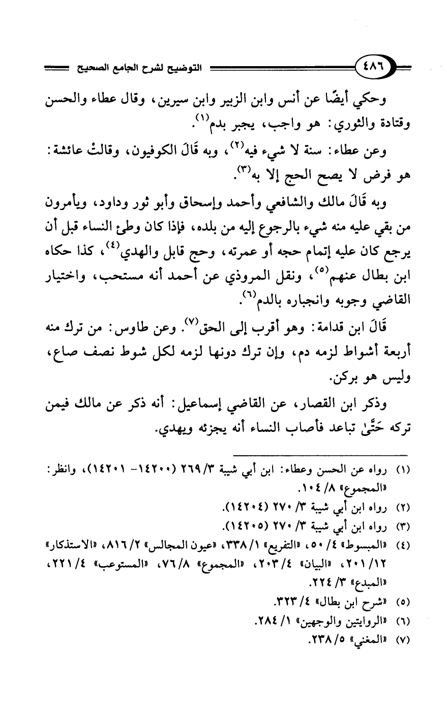 وحكي أيضًا عن أنس وابن الزبير وابن سيرين، وقال عطاء والحسن وقتادة والثوري: هو واجب، يجبر بدم (¬1).