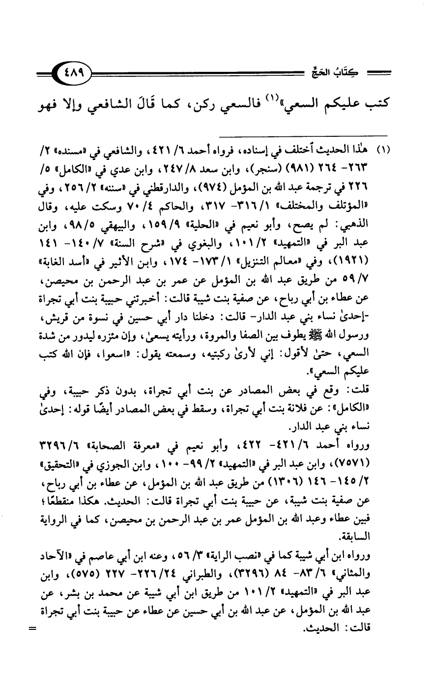 (¬1) هذا الحديث اختلف في إسناده، فرواه أحمد 6/ 421، والشافعي في "مسنده" 2/ 263 - 264 (981) (سنجر)، وابن سعد 8/ 247، وابن عدي في "الكامل" 5/ 226 في ترجمة عبد الله بن المؤمل (974)، والدارقطني في سننه" 2/ 256، وفي "المؤتلف والمختلف" 1/ 316 - 317، والحاكم 4/ 70 وسكت عليه، وقال الذهبي: لم يصح، وأبو نعيم في "الحلية" 9/ 159، والبيهقي 5/ 98، وابن عبد البر في "التمهيد" 2/ 101، والبغوي في "شرح السنة" 7/ 140 - 141 (1921)، وفي "معالم التنزيل" 1/ 173 - 174، وابن الأثير في "أسد الغابة" 7/ 59 من طريق عبد الله بن المؤمل عن عمر بن عبد الرحمن بن محيصن، عن عطاء بن أبي رباح، عن صفية بنت شيبة قالت: أخبرتني حبيبة بنت أبي تجراة -إحدى نساء بني عبد الدار- قالت: دخلنا دار أبي حسين في نسوة من قريش، ورسول الله - صلى الله عليه وسلم - يطوف بين الصفا والمروة، ورأيته يسعى، وإن مئزره ليدور من شدة السعي، حتى لأقول: إني لأرى ركبتيه، وسمعته يقول: "اسعوا، فإن الله كتب عليكم السعي".