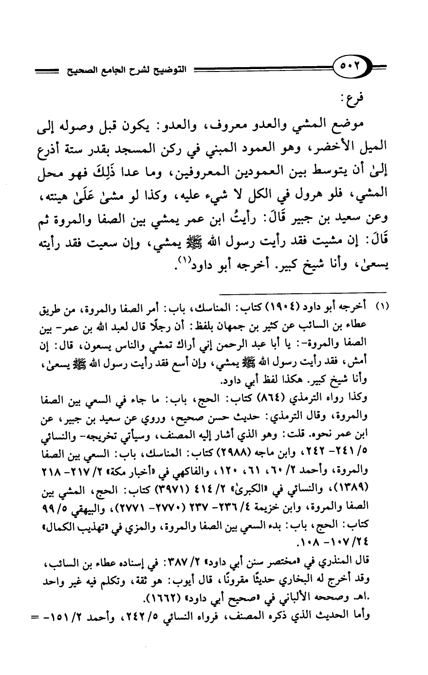 موضع المشي والعدو معروف، والعدو: يكون قبل وصوله إلى الميل الأخضر، وهو العمود المبني في ركن المسجد بقدر ستة أذرع إلى أن يتوسط بين العمودين المعروفين، وما عدا ذَلِكَ فهو محل المشي، فلو هرول في الكل لا شيء عليه، وكذا لو مشى عَلَى هينته، وعن سعيد بن جبير قَالَ: رأيتُ ابن عمر يمشي بين الصفا والمروة ثم قَالَ: إن مشيت فقد رأيت رسول الله - صلى الله عليه وسلم - يمشي، وإن سعيت فقد رأيته يسعى، وأنا شيخ كبير. أخرجه أبو داود (¬1).