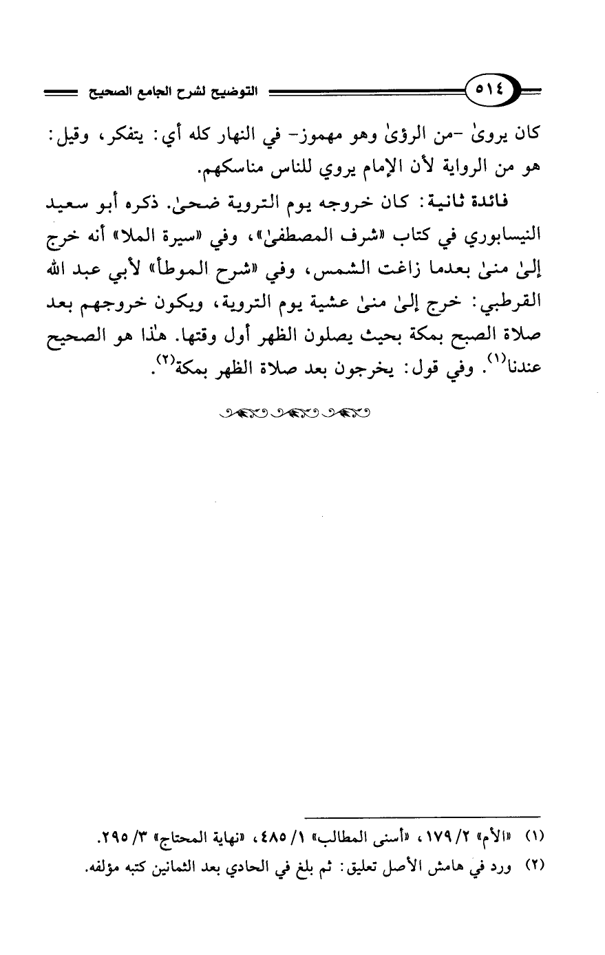 فائدة ثانية: كان خروجه يوم التروية ضحى. ذكره أبو سعيد النيسابوري في كتاب "شرف المصطفي"، وفي "سيرة الملا" أنه خرج إلى منى بعدما زاغت الشمس، وفي "شرح الموطأ" لأبي عبد الله القرطبي: خرج إلى منى عشية يوم التروية، ويكون خروجهم بعد صلاة الصبح بمكة بحيث يصلون الظهر أول وقتها. هذا هو الصحيح عندنا (¬1). وفي قول: يخرجون بعد صلاة الظهر بمكة (¬2).