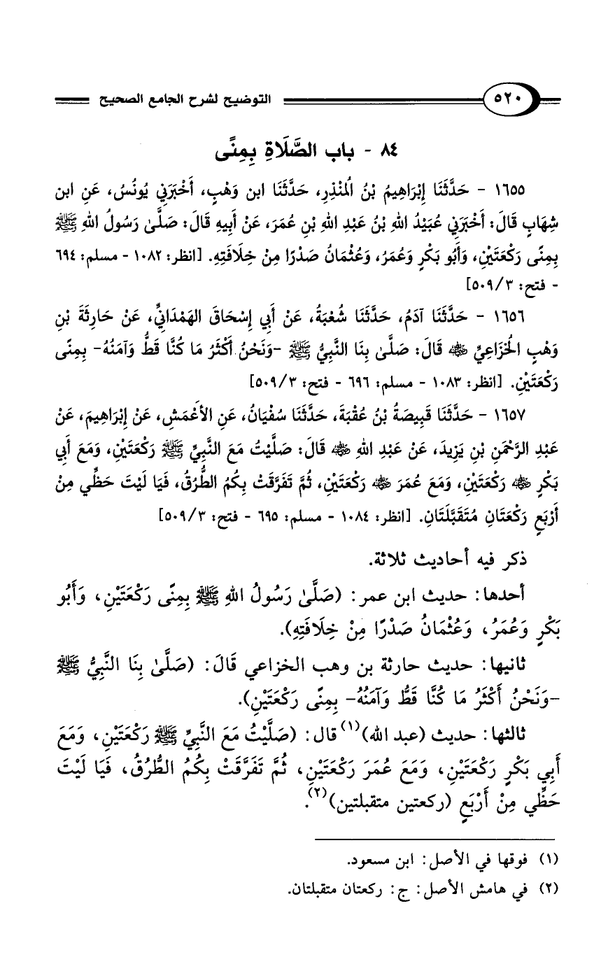 1657 - حَدَّثَنَا قَبِيصَةُ بْنُ عُقْبَةَ، حَدَّثَنَا سُفْيَانُ، عَنِ الأَعْمَشِ، عَنْ إِبْرَاهِيمَ، عَنْ عَبْدِ الرَّحْمَنِ بْنِ يَزِيدَ، عَنْ عَبْدِ اللهِ - رضي الله عنه - قَالَ: صَلَّيْتُ مَعَ النَّبِيِّ - صلى الله عليه وسلم - رَكْعَتَيْنِ، وَمَعَ أَبِي بَكْرٍ - رضي الله عنه - رَكْعَتَيْنِ، وَمَعَ عُمَرَ - رضي الله عنه - رَكْعَتَيْنِ، ثُمَّ تَفَرَّقَتْ بِكُمُ الطُّرُقُ، فَيَا لَيْتَ حَظِّي مِنْ أَرْبَعٍ رَكْعَتَانِ مُتَقَبَّلَتَانِ. [انظر: 1084 - مسلم: 695 - فتح: 3/ 509]