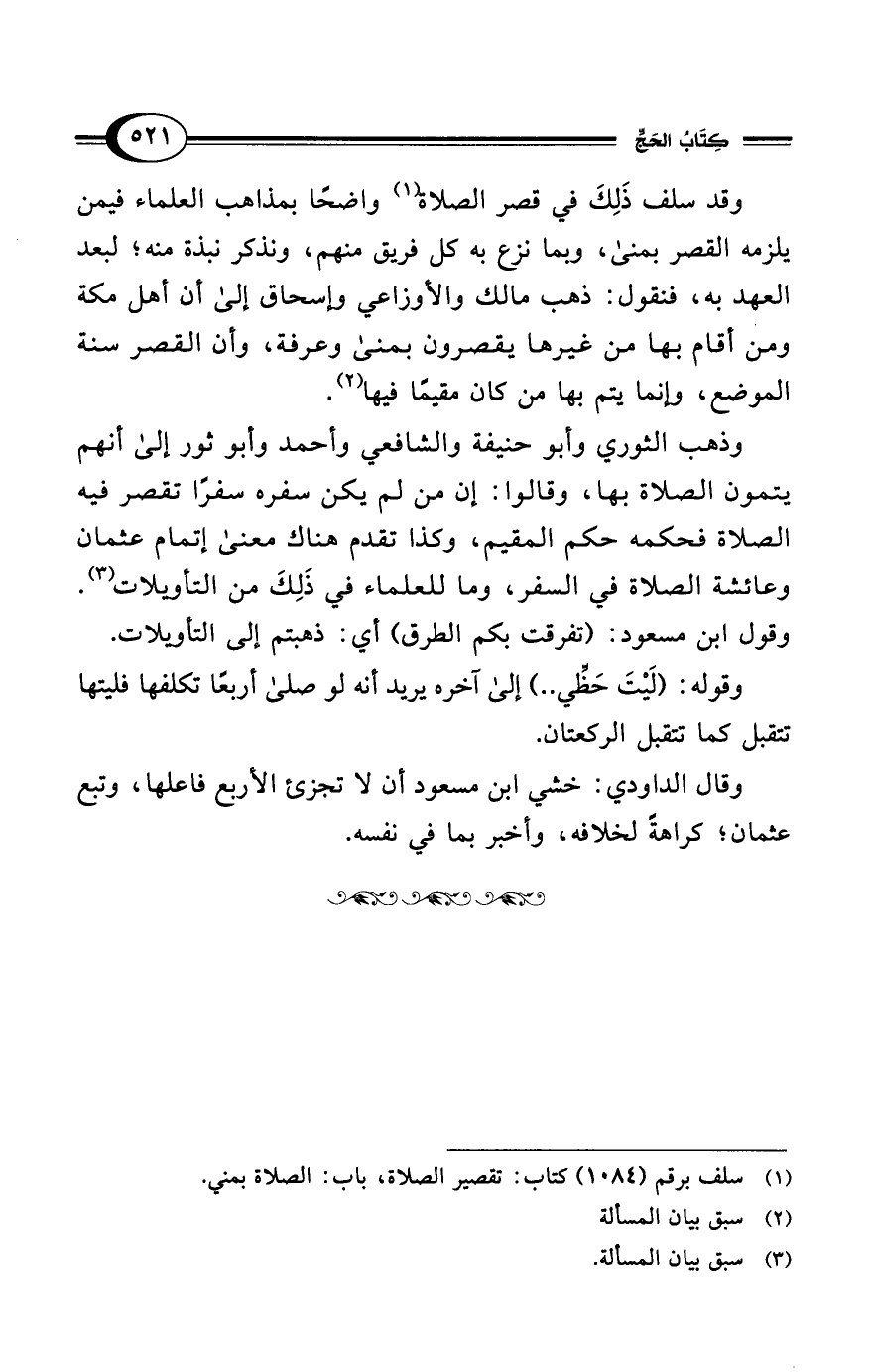 وذهب الثوري وأبو حنيفة والشافعي وأحمد وأبو ثور إلى أنهم يتمون الصلاة بها، وقالوا: إن من لم يكن سفره سفرًا تقصر فيه الصلاة فحكمه حكم المقيم، وكذا تقدم هناك معنى إتمام عثمان وعائشة الصلاة في السفر، وما للعلماء في ذَلِكَ من التأويلات (¬3).