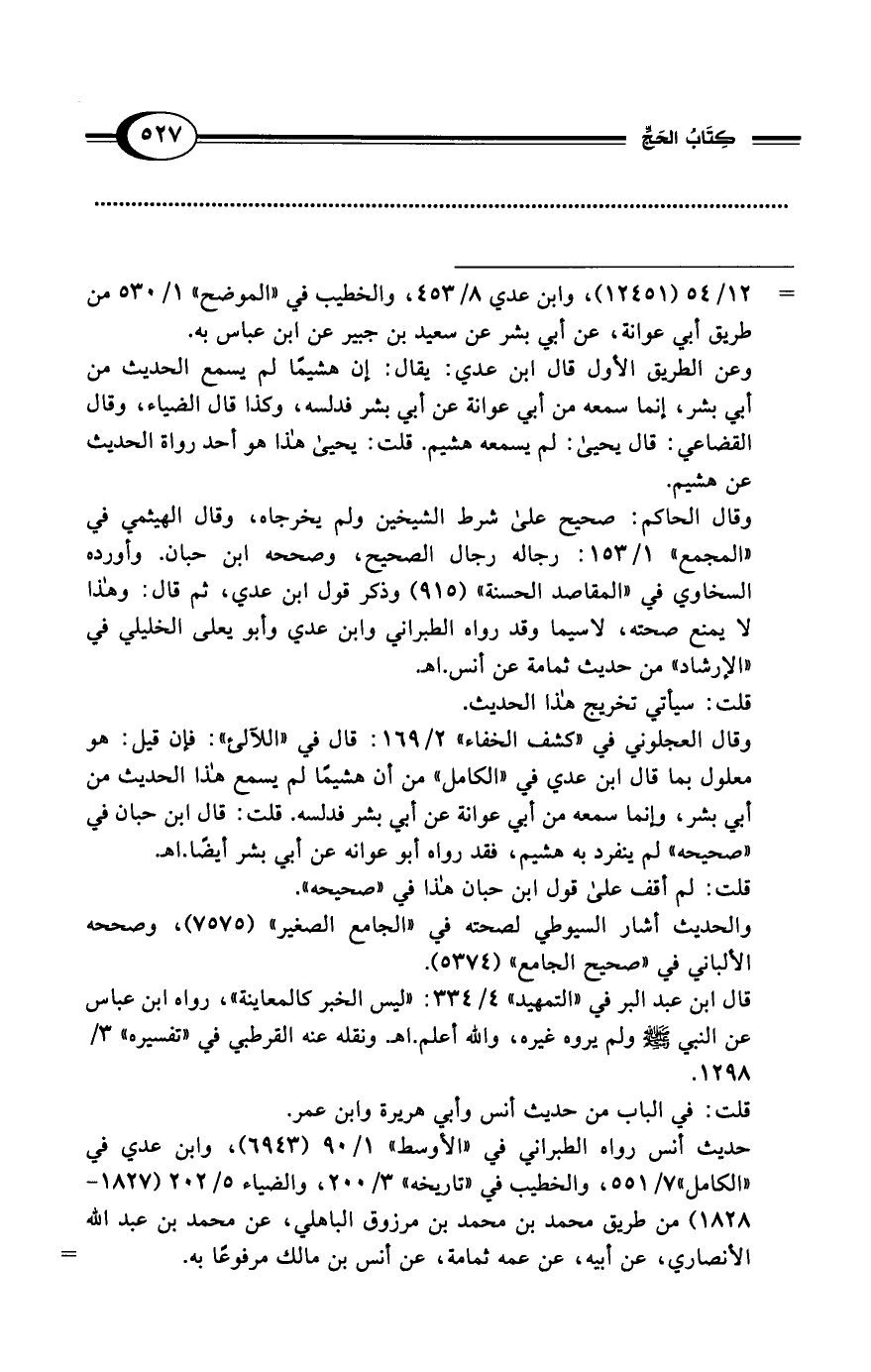 وقال العجلوني في "كشف الخفاء" 2/ 169: قال في "اللآلئ": فإن قيل: هو معلول بما قال ابن عدي في "الكامل" من أن هشيمًا لم يسمع هذا الحديث من أبي بشر، وإنما سمعه من أبي عوانة عن أبي بشر فدلسه، قلت: قال ابن حبان في "صحيحه" لم ينفرد به هشيم، فقد رواه أبو عوانه عن أبي بشر أيضًا. اهـ.