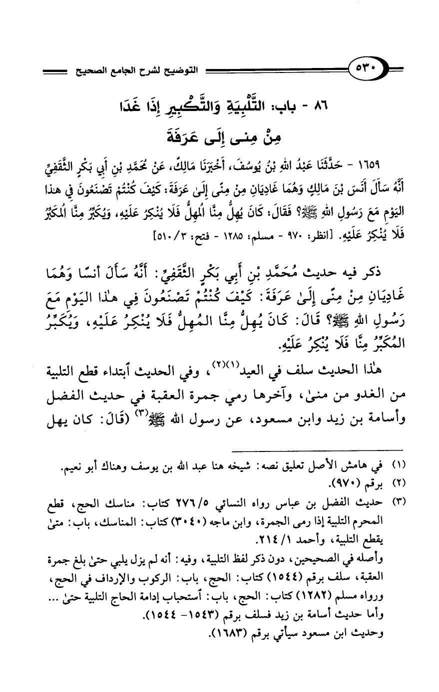 1659 - حَدَّثَنَا عَبْدُ اللهِ بْنُ يُوسُفَ، أَخْبَرَنَا مَالِكٌ، عَنْ مُحَمَّدِ بْنِ أَبِي بَكْرٍ الثَّقَفِيِّ أَنَّهُ سَأَلَ أَنَسَ بْنَ مَالِكٍ وَهُمَا غَادِيَانِ مِنْ مِنًى إِلَى عَرَفَةَ: كَيْفَ كُنْتُمْ تَصْنَعُونَ فِي هَذَا اليَوْمِ مَعَ رَسُولِ اللهِ - صلى الله عليه وسلم -؟ فَقَالَ: كَانَ يُهِلُّ مِنَّا المُهِلُّ فَلاَ يُنْكِرُ عَلَيْهِ، وَيُكَبِّرُ مِنَّا المُكَبِّرُ فَلاَ يُنْكِرُ عَلَيْهِ. [انظر: 970 - مسلم: 1285 - فتح: 3/ 510]