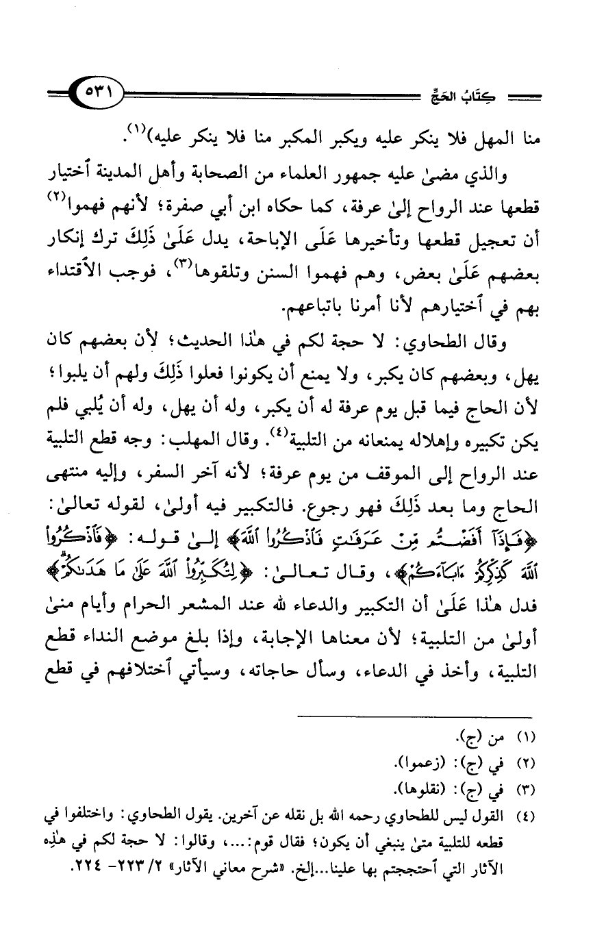 (¬4) القول ليس للطحاوي رحمه الله بل نقله عن آخرين. يقول الطحاوي: واختلفوا في قطعه للتلبية متى ينبغي أن يكون؛ فقال قوم: ... ، وقالوا: لا حجة لكم في هذِه الآثار التي احتججتم بها علينا ... إلخ. "شرح معاني الآثار" 2/ 223 - 224.
