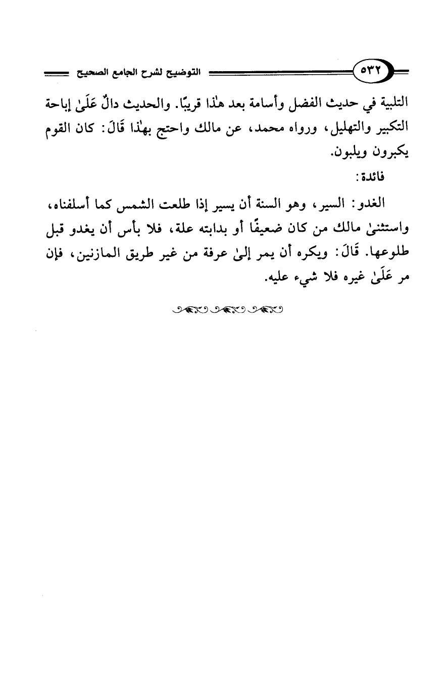 التلبية في حديث الفضل وأسامة بعد هذا قريبًا. والحديث دالٌ عَلَى إباحة التكبير والتهليل، ورواه محمد، عن مالك واحتج بهذا قَالَ: كان القوم يكبرون ويلبون.