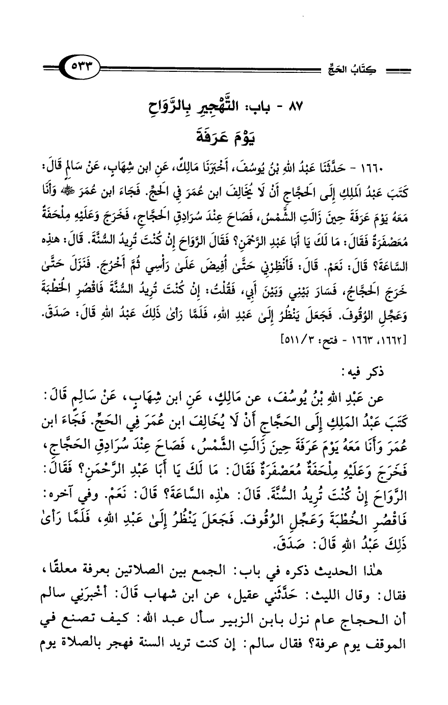 عن عَبْدُ اللهِ بْنُ يُوسُفَ، أَخْبَرَنَا مَالِكٍ، عَنِ ابْنِ شِهَابٍ، عَنْ سَالِمٍ قَالَ: كَتَبَ عَبْدُ المَلِكِ إِلَى الحَجَّاجِ أَنْ لاَ يُخَالِفَ ابْنَ عُمَرَ فِي الحَجِّ. فَجَاءَ ابْنُ عُمَرَ وَأَنَا مَعَهُ يَوْمَ عَرَفَةَ حِينَ زَالَتِ الشَّمْسُ، فَصَاحَ عِنْدَ سُرَادِقِ الحَجَّاجِ، فَخَرَجَ وَعَلَيْهِ مِلْحَفَةٌ مُعَصْفَرَةٌ فَقَالَ: مَا لَكَ يَا أَبَا عَبْدِ الرَّحْمَنِ؟ فَقَالَ: الرَّوَاحَ إِنْ كُنْتَ تُرِيدُ السُّنَّةَ. قَالَ: هَذِهِ السَّاعَةَ؟ قَالَ: نَعَمْ. وفي آخره: فَاقْصُرِ الخُطْبَةَ وَعَجِّلِ الوُقُوفَ. فَجَعَلَ يَنْظُرُ إِلَى عَبْدِ اللهِ، فَلَمَّا رَأَى ذَلِكَ عَبْدُ اللهِ قَالَ: صَدَقَ.
