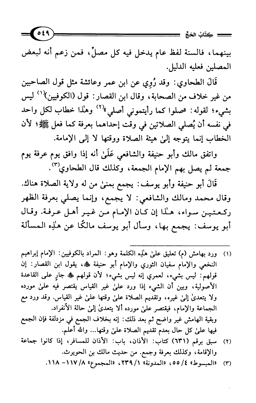 قَالَ الطحاوي: وقد رُوِي عن ابن عمر وعائشة مثل قول الصاحبين من غير خلاف من الصحابة، وقال ابن القصار: قول (الكوفيين) (¬1) ليس بشيء؛ لقوله: "صلوا كما رأيتموني أصلي" (¬2) وهذا خطاب لكل واحد في نفسه أن يُصلي الصلاتين في وقت إحداهما بعرفة كما فعل - صلى الله عليه وسلم -؛ لأن الخطاب إنما يتوجه إلى هيئة الصلاة ووقتها لا إلى الإمامة.